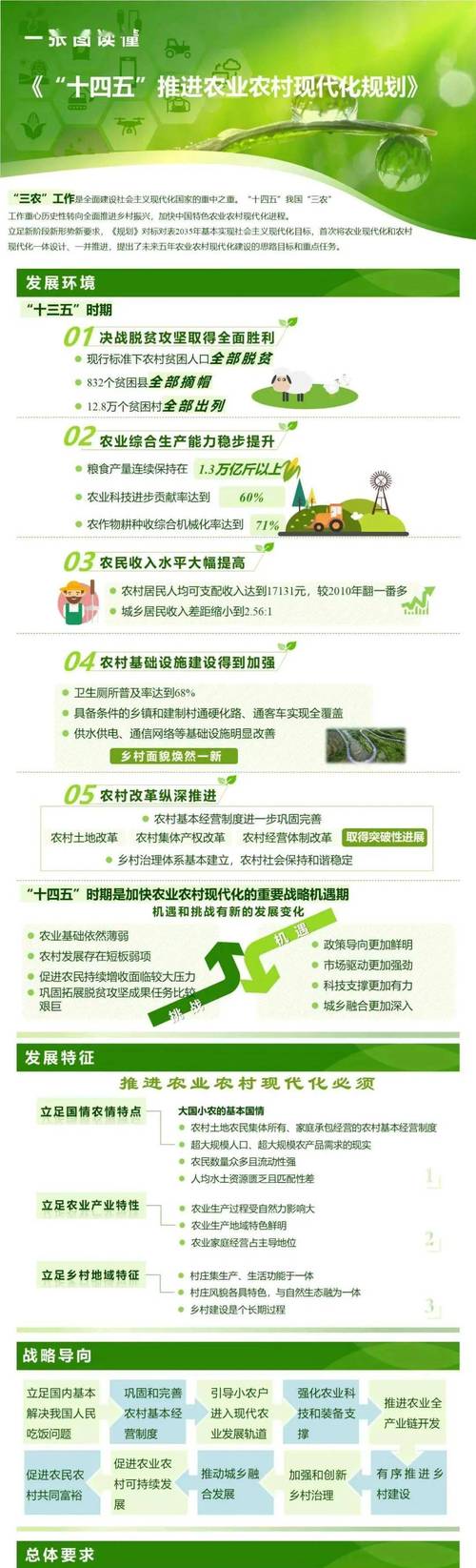 2、目标任务:到2025年,农业农村现代化取得重要进展,农业基础设施现代化迈上新台阶,农村基础设施基本完备,农村人居环境显著改善,农业基础地位更加稳固,城乡融合发展体制机制基本建立。到2035年,乡村全面振兴取得决定性进展,农业农村现代化基本实现。
